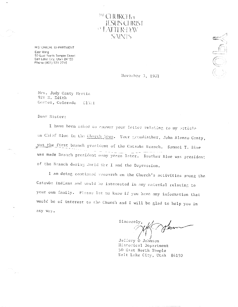 I have been asked to answer your letter relating to my article on Chief Blue in the Church News. Your grandfather, John Alonzo Canty, was the first branch president of the Catawba Branch. Samuel T. Blue was made Branch president many years later. Brother Blue was president of the Branch during world war I and the Depression.